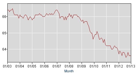 The irony is not initially very obvious to many, but once you see it, it’s undeniable. Let’s dig a little deeper. Take a look at the labor participation rate graph below taken directly from the Bureau of Labor Statistics:
