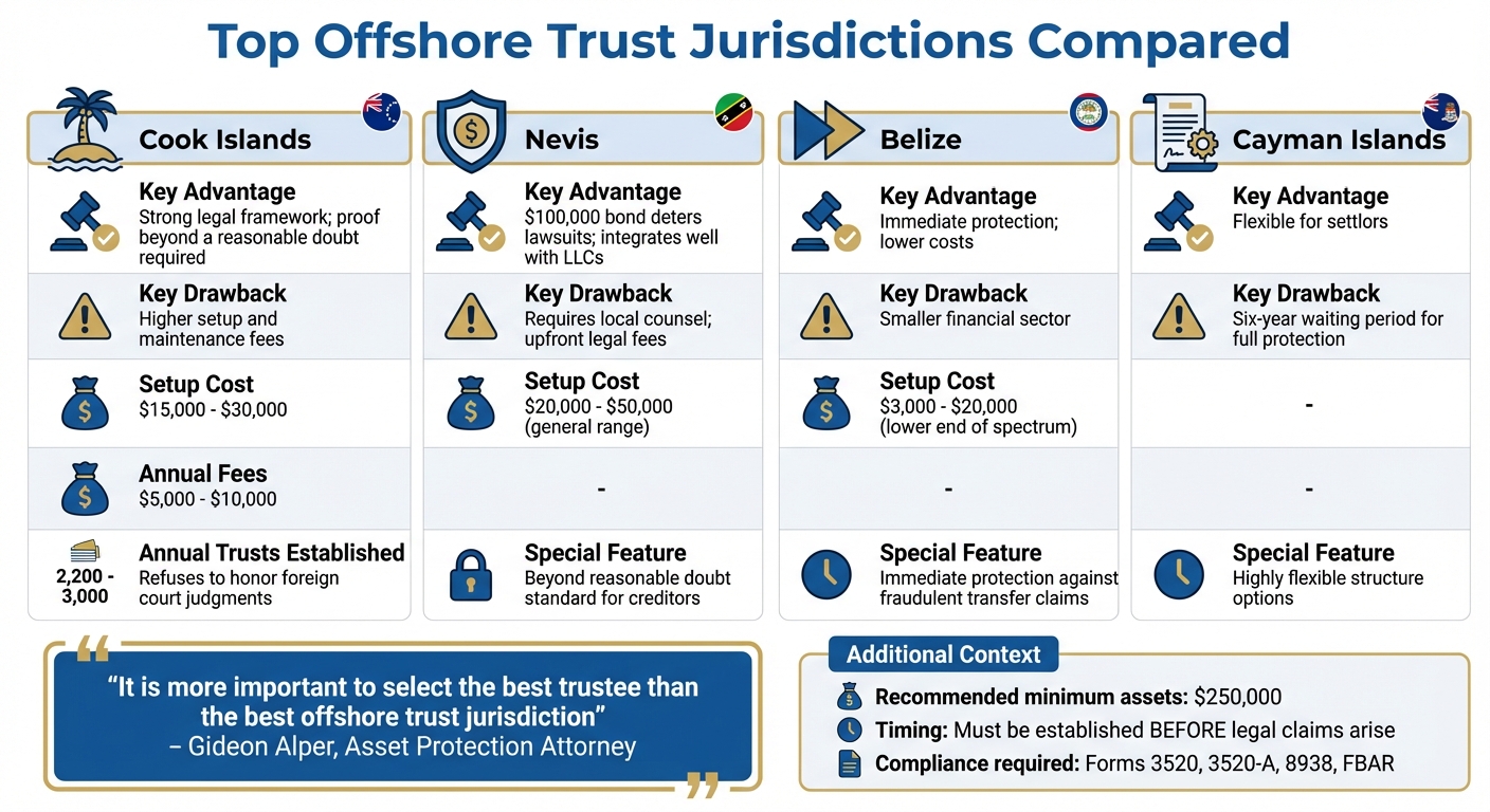 Setup costs vary by location, with Cook Islands trusts ranging from $15,000 to $30,000 and annual fees between $5,000 and $10,000. Belize is a lower-cost option, with average setup fees across jurisdictions falling between $3,000 and $20,000.