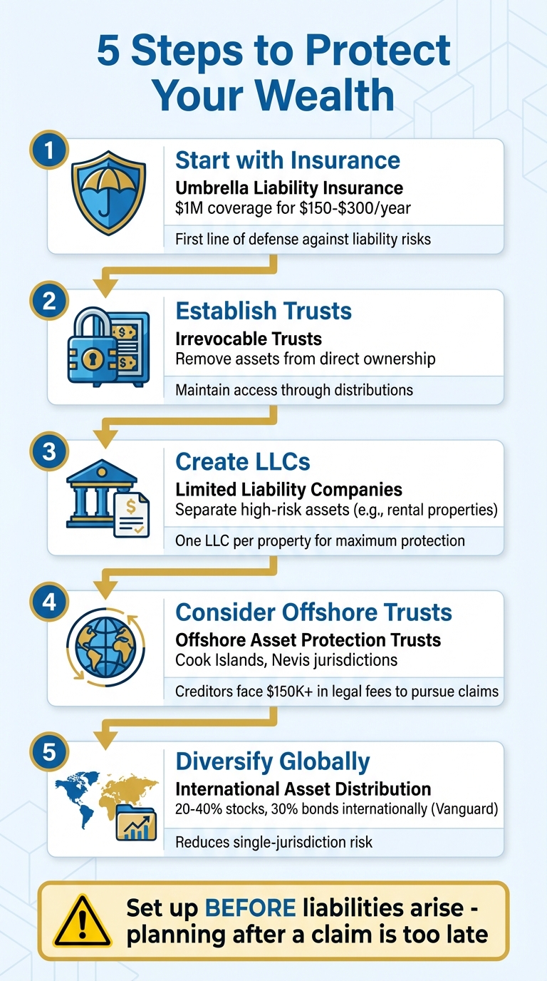 Start with umbrella liability insurance – a policy offering $1 million in coverage typically costs just $150–$300 per year and provides immediate protection against liability risks. Beyond that, consider strategies like forming LLCs, setting up irrevocable trusts, or using offshore entities to distribute and manage risks effectively. For retirement accounts, tap into their built-in protections: employer-sponsored plans under ERISA provide unlimited bankruptcy protection, while traditional and Roth IRAs safeguard up to $1,512,350. Together, these tactics form a strong defense tailored to your overall financial strategy.