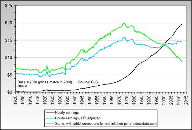 Note: these real average earnings numbers are calculated using the current BLS CPI-U formula. This formula does not measure the change in prices as previous BLS CPI formulas have done. The current BLS CPI formula measures the change in the cost of living assuming substitution of goods and using hedonic pricing. If the previous BLS CPI formulas that did measure the change in prices were used real average earnings would be falling by approximately -5% (for more information click here). As we can see in the above chart from Shadowstats.com, when the previous the BLS CPI formulas which do not assume substitution of goods nor use hedonic pricing are applied we can see real wages have been continuously falling for 40 years since peaking out in 1972.