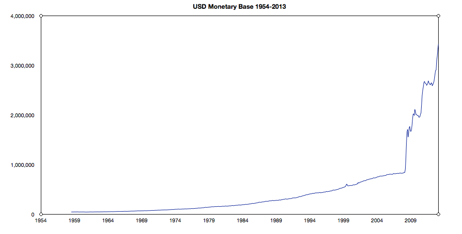 Money supply inflation began to accelerate in the late 1960s which motivated the Federal Reserve to remove the US dollar from gold backing in 1971 replacing it with US Treasury backing. Not surprisingly, as we saw above, the following year in 1972 real wages in the USA peaked out and have been on a steady 40 year decline since. QE is money supply inflation as we detailed in this July 10th note titled, “The Fed Has Lost Control and QE Has Failed”. QE is money supply inflation on steroids increasing the monetary base a mind boggling $1 trillion every year. If QE can never end, as we explained in this September 18 note, “No Fed Taper Confirms: R.I.P. US Dollar”, then the below trend would have to be sustainable. Is the below trend sustainable?