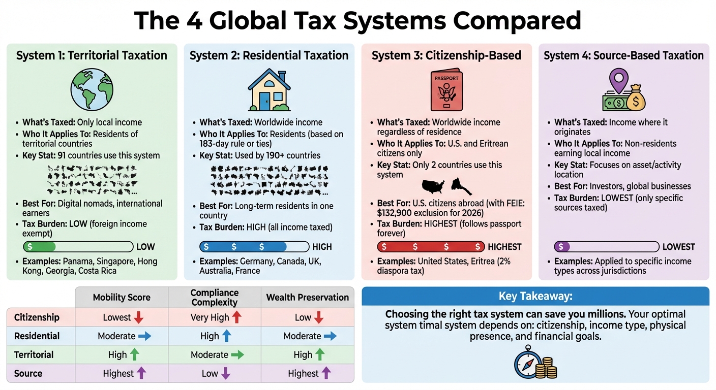 Understanding the four global tax systems – territorial, residential, citizenship-based, and source-based – is key to making smart financial decisions that could save you substantial amounts in taxes. Choosing the right tax strategy depends on your income sources, where you live, and your long-term financial goals.