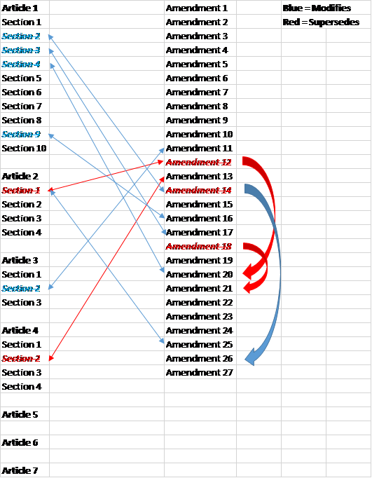 I also plan to address the modifications that weren’t made via any official methods, but for now, let’s just take a look at the “official” changes made to this “living, breathing” document. Below is a chart where I track all the times the constitution has been modified or superseded in some way. It’s rather tangled. And from what I’ve noticed, there’s a lot going on in there that has powerful people voting on their powers to retain and grow their powers. When plotted out this way, how does it look to you… other than contradictory and self-defeating?