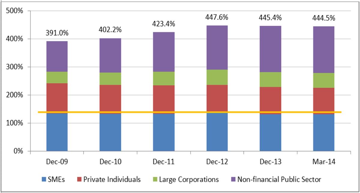 If you look closely at the above chart (and you can enlarge it by clicking on it), you see a few things at play: Small to Mid-Sized businesses are stagnated at their levels of indebtedness. Private sector indebtedness has decreased. Public sector indebtedness is up.