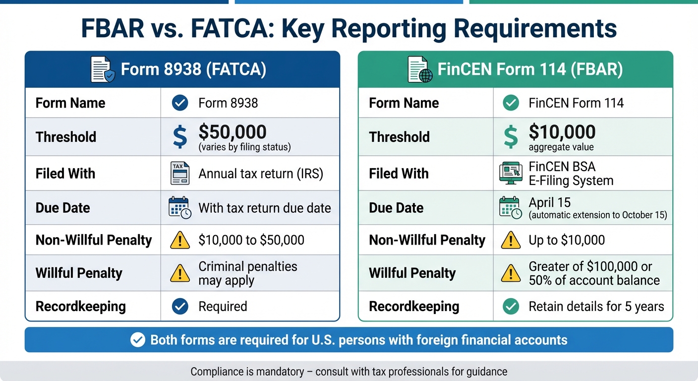 | Requirement | Form 8938 (FATCA) | FinCEN Form 114 (FBAR) |