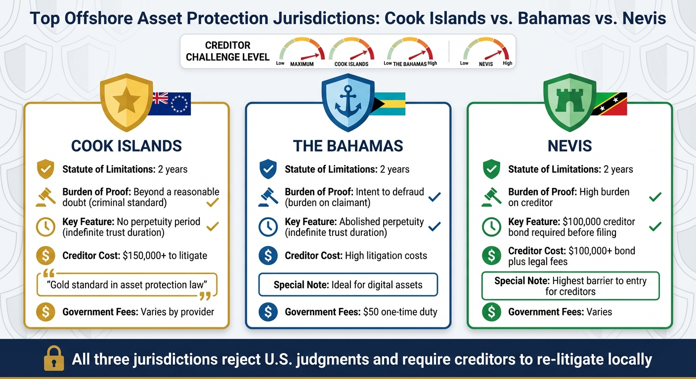 Nevis, on the other hand, requires creditors to post a $100,000 bond before filing any legal action. The Bahamas offers its own advantages, including a one-time government trust duty of just $50.