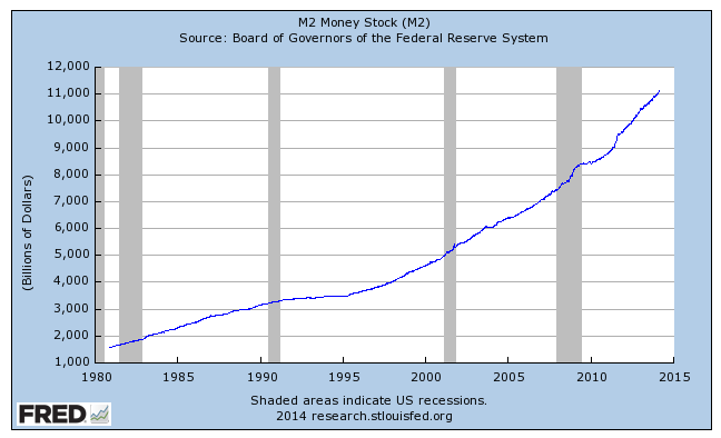 This is the graph of the M2 money supply (M2 money supply definition from Investopedia) in the US from 1980 until today. Notice any trend?