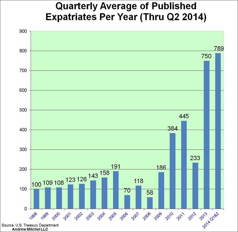 This graph shows the average number of Americans renouncing their citizenship per quarter. For 1998, you can see that on average, 100 people per quarter gave up their US citizenship. That’s only 400 per year. Fast forward to 2013, you can see that 750 per quarter, or 3000 people gave up their US citizenship. And in Q1 and Q2 2014, we have already more than matched that number.