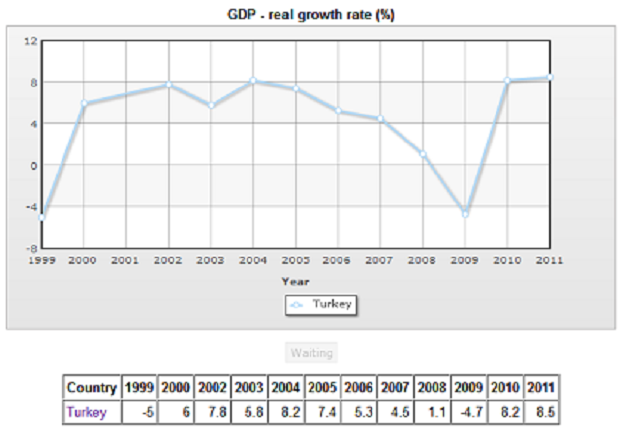 Turkey is also one of the fastest growing economies in the world. Like the rest of the world, they showed a decline during the most recent crisis, although it was significantly less severe than in many countries. Only in 2009 did Turkey see a decline in real GDP of -4.7%.
