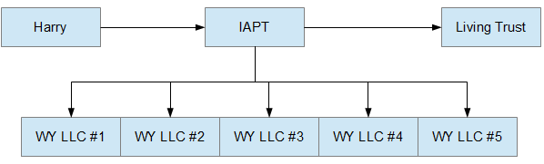 This structure provides a layer of anonymity with his assets since they are no longer in Harry’s name. Each asset is owned by the Private Wyoming LLC. The IAPT is the 100% member of each Wyoming LLC with Harry as the trust grantor and his living trust as beneficiary.