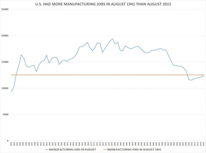 The first question might naturally be: Has manufacturing EVER outnumbered government employees? And the answer would be, yes. Up to 1989, in fact, manufacturing employment was higher than that of government. We actually have LESS people employed in manufacturing today than we did in the year leading up to the attack on Pearl Harbor.