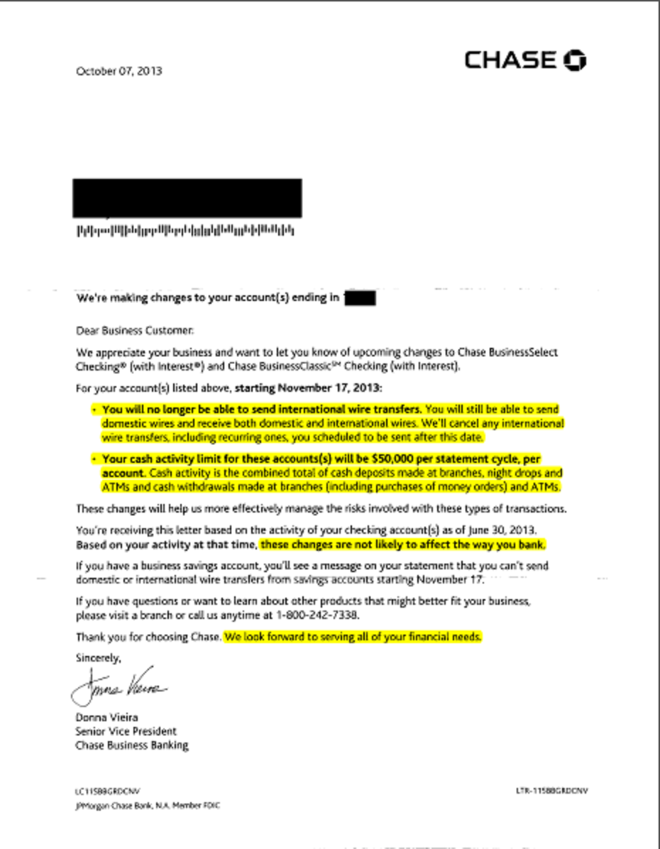 Just today one of my clients sent me this letter. This was the actual letter he received from his US bank, Chase: