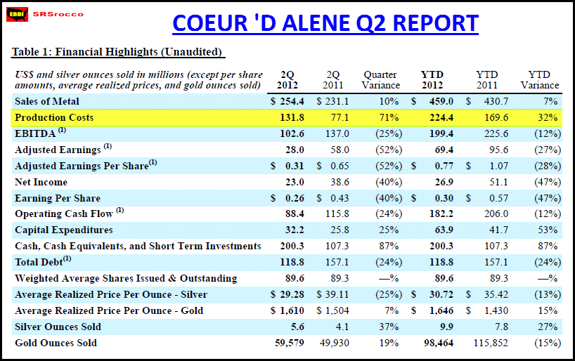 In percentage terms, these numbers are astounding! Hecla is on pace for the year to mill 120,000 more tons of ore than just 10 years ago, and yet, they get much less than half the silver yield for all of their hard work! Now consider how all business costs, especially fuel for heavy mining equipment, has skyrocketed in the intervening 10 years and it’s not too hard to understand silver mining is not a very profitable business these days for Hecla. The stock is reflecting this and has not been this cheap since 2004, when silver was at single digit prices. The moral of the story being that silver prices are not keeping up with the costs of mining the stuff. Not even close. Take a look at Coeure D’ Alene Q2 financial results.