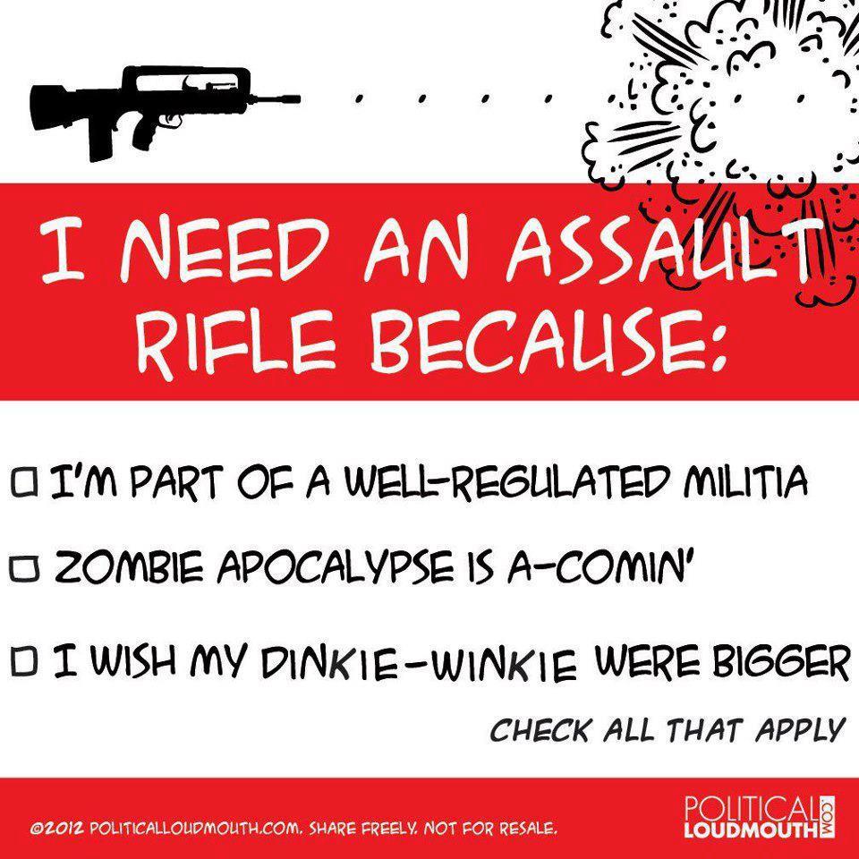 How can the NEEDS of individuals be determined simply by assessing the thing in question? How do we look at a gun and say, “You don’t need it”? That is typical government means testing, though, isn’t it? Paying someone to be unemployed for 99 weeks, bailing out irresponsible banks and insolvent car companies, bankrupting Social Security and lest we forget the NEED for wars. Yeah, because government has done such a bang-up job on assessing NEED and allocating resources already, by all means, decide for me what I NEED! Specifically, make some unilateral decisions on what I NEED to defend myself. What’s another life lost in the crosshairs of myopic government policy?